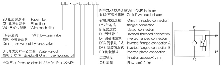 注:*為過(guò)濾精度,#為過(guò)濾材料,若使用介質(zhì)為水—乙二醇,濾材為紙質(zhì),帶發(fā)訊器和旁通閥,則過(guò)濾器型號(hào)為:ZUI·BH—H63×*P,濾芯型號(hào)為HX·BH-63×*濾材為化纖,帶發(fā)訊器,則過(guò)濾器型號(hào)為:QU·BH-63×*P, 濾芯型號(hào)為:HX·BH-63×*Q,濾材為金屬網(wǎng),帶發(fā)訊器,則過(guò)濾型號(hào)為:WU-H63×*P,濾芯型號(hào)為:HX-63×*W