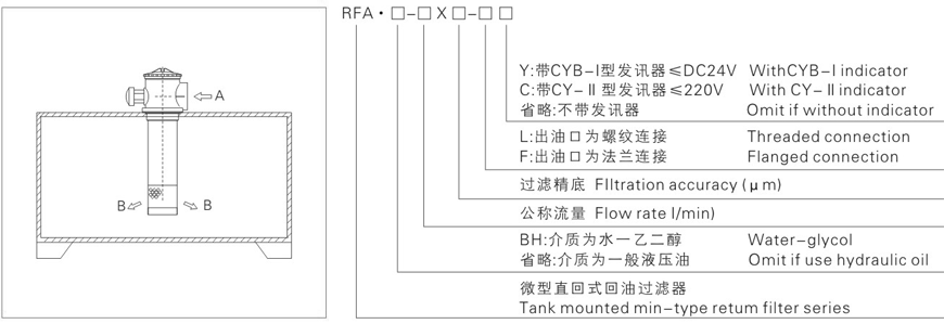 注:*為過濾精度,若使用介質(zhì)為水一乙二醇,公稱流量為63L/min,過濾精度為10μm,帶CYB-Ⅰ發(fā)訊器,則過濾器型號為RFA·BH-63x10L-Y,濾芯型號為FAX·BH 63x10。