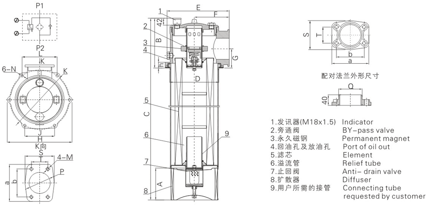 6、具有目測指示和電發(fā)訊二合一發(fā)訊裝置、溢流管、積污盅;當(dāng)濾芯逐步堵塞后,可在目測表上觀察濾芯堵塞情況,同時還可接電發(fā)訊(發(fā)訊值為0.35MPa)。在濾芯底部設(shè)置溢流管及積污盅,更換濾芯時可隨同一起帶出,從而避免了污染物重新掉入油箱內(nèi)的現(xiàn)象。