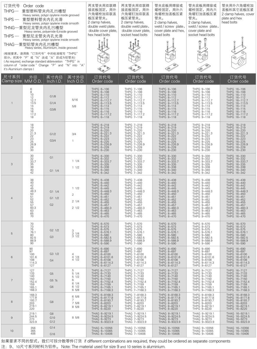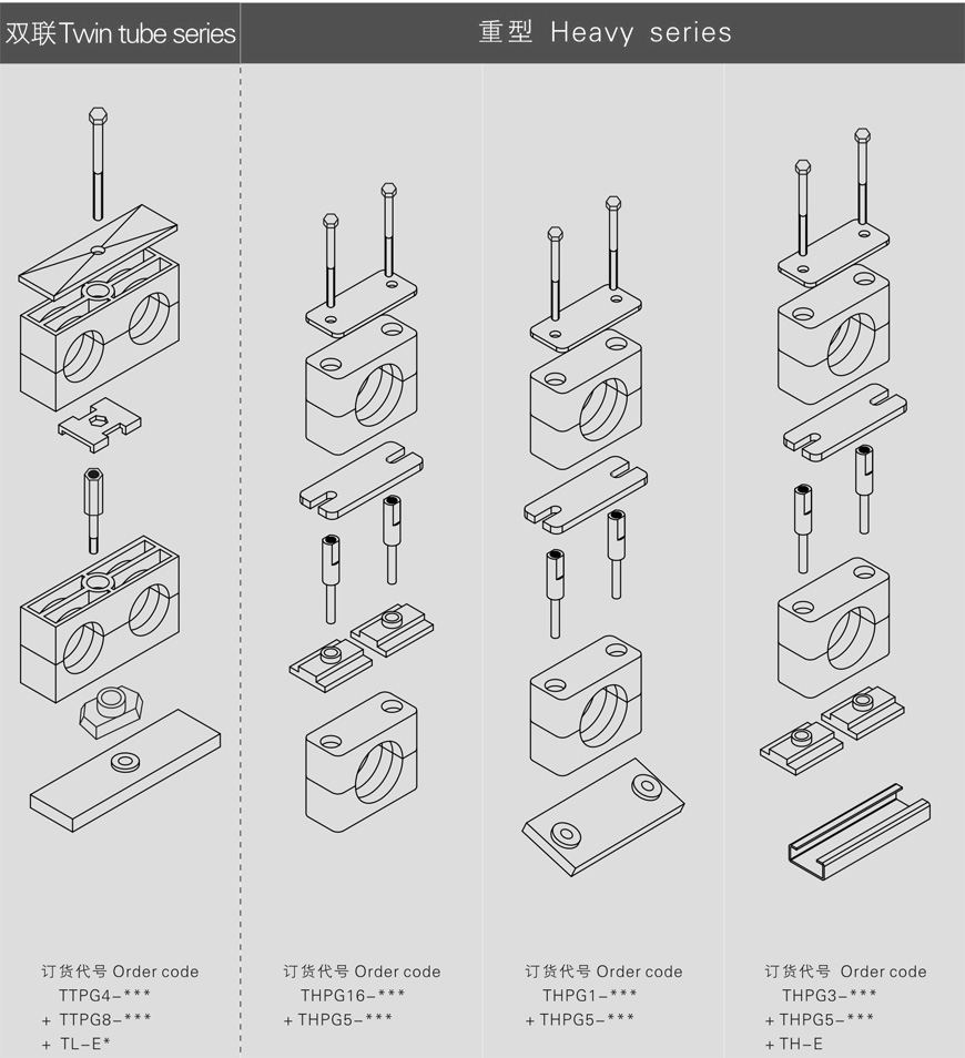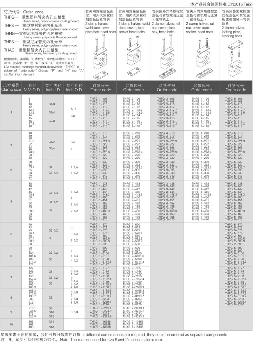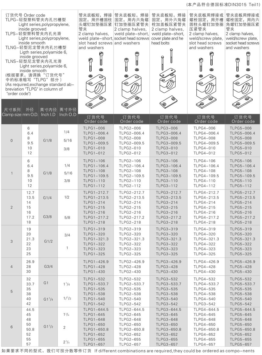 管夾適用范圍 輕型系列管夾應用于6種尺寸系列的普通機械壓力管子,管子外徑Φ6~57mm。 雙聯系列管夾應用于5種尺寸系列的普通機械壓力管子,管子外徑Φ6~42mm。 重型系列管夾應用于8種尺寸系列的高機械壓力管子,管子外徑Φ8~220mm。
