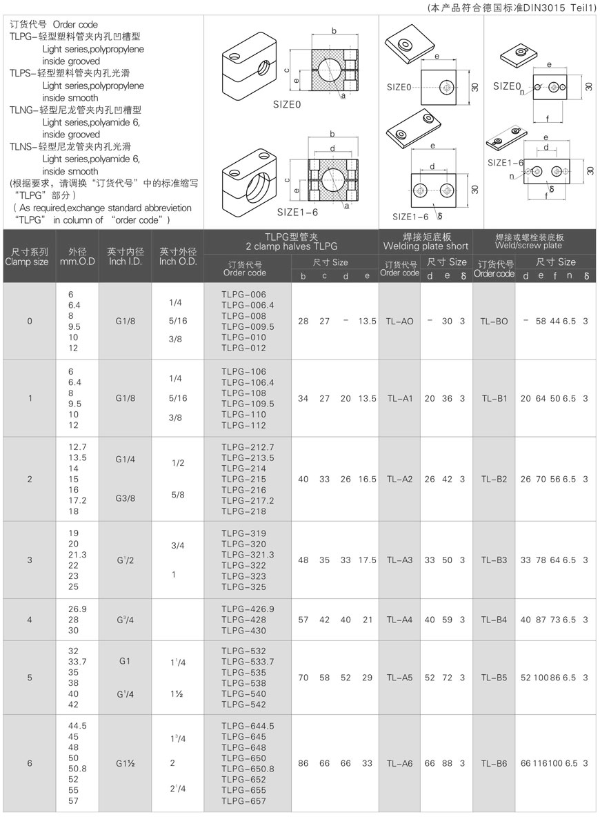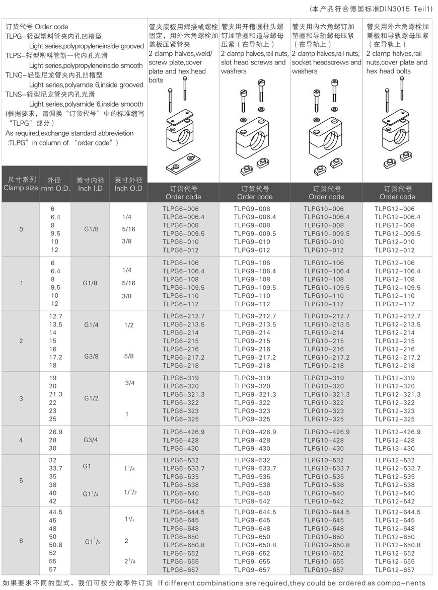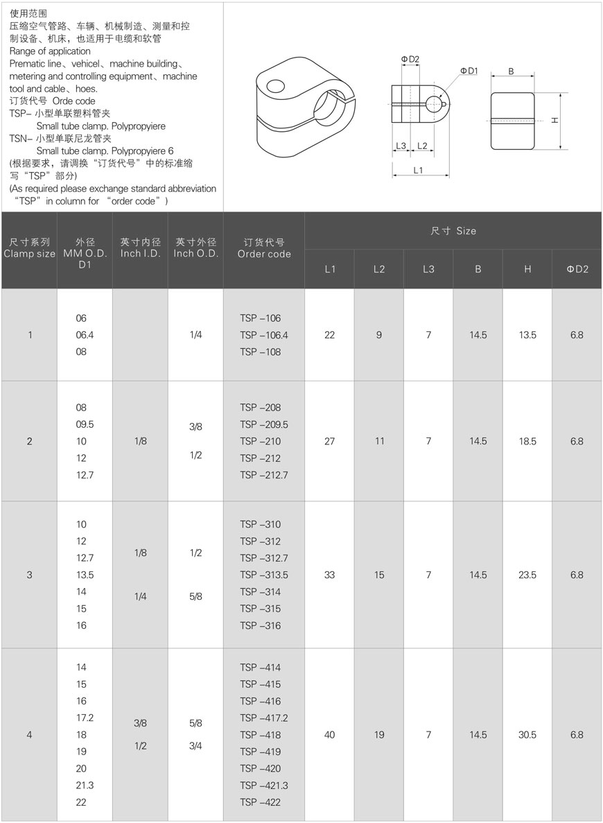 管夾適用范圍 輕型系列管夾應用于6種尺寸系列的普通機械壓力管子,管子外徑Φ6~57mm。 雙聯系列管夾應用于5種尺寸系列的普通機械壓力管子,管子外徑Φ6~42mm。 重型系列管夾應用于8種尺寸系列的高機械壓力管子,管子外徑Φ8~220mm。