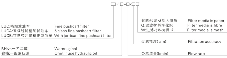 (1)*為過濾精度。若使用介質為水一乙二醇時,公稱流量63L/min,過濾精度5μm,過濾材質為紙質時,濾油車的型號為LUC·BH-63x5或 LUCA·BH-63X5,精濾器濾芯的型號為CZX·BH-63X5或 CZXA·BH-63X5。
